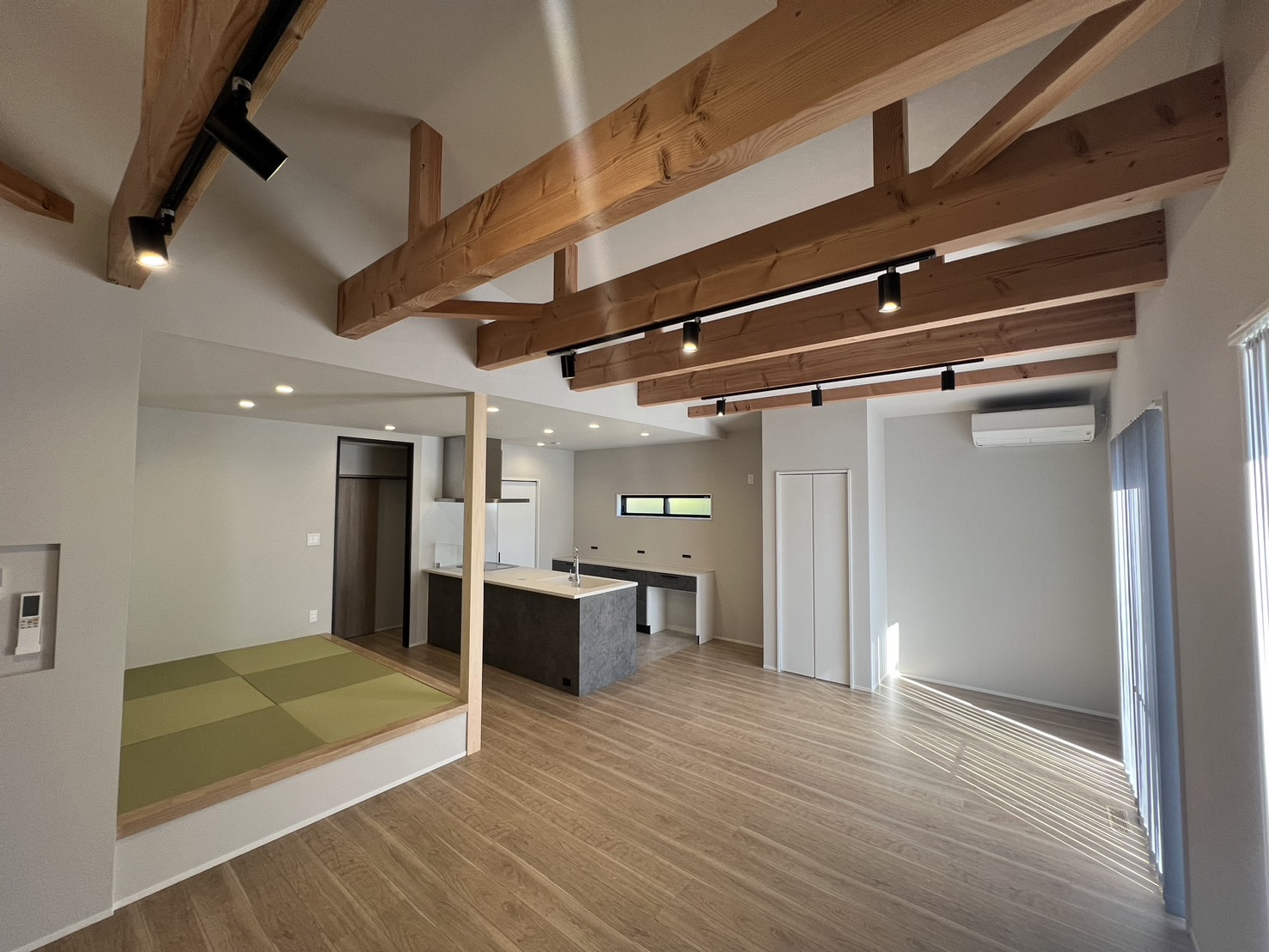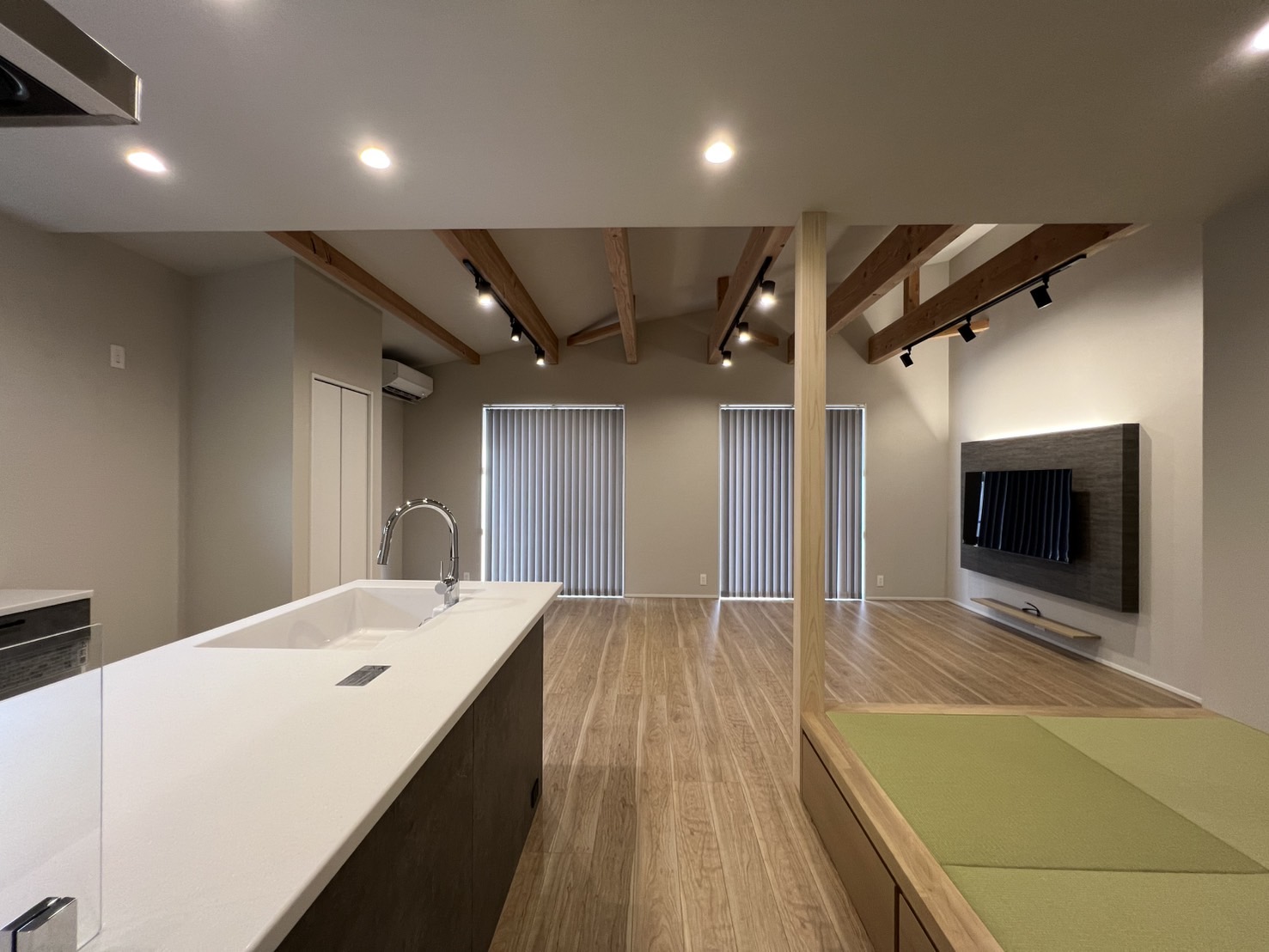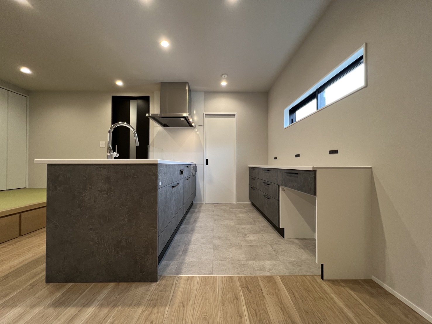 小上がりのタタミでほっと一息。 キッチンから洗面室へはスムーズな家事動線。 玄関正面にはファミクロを配置して、帰宅後の動きもストレスフリーに。