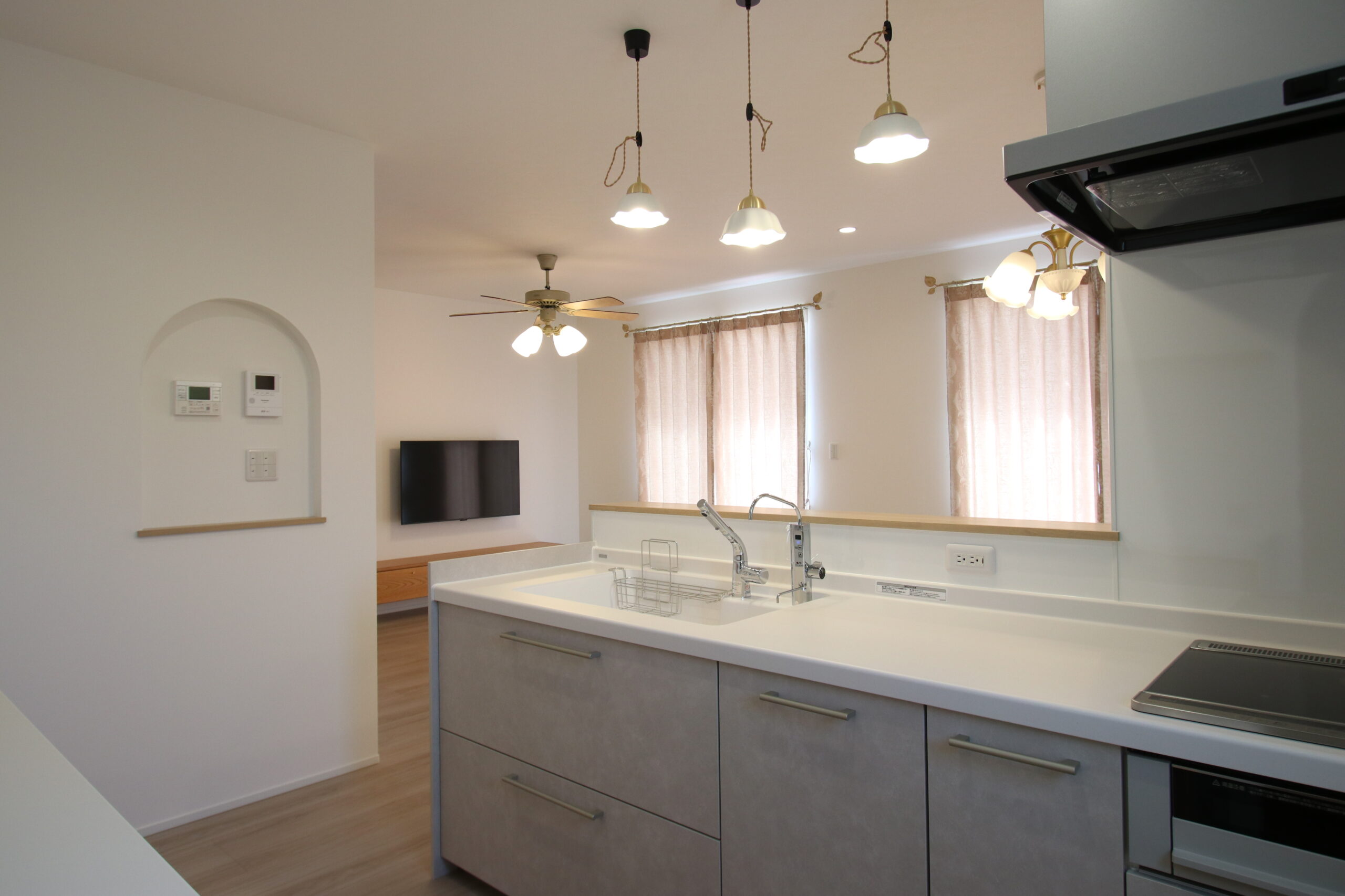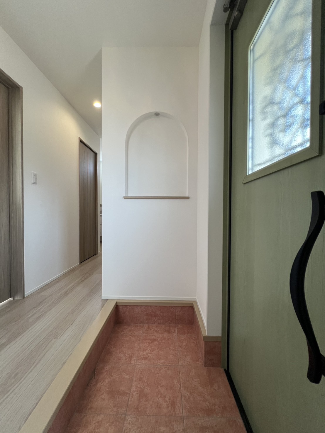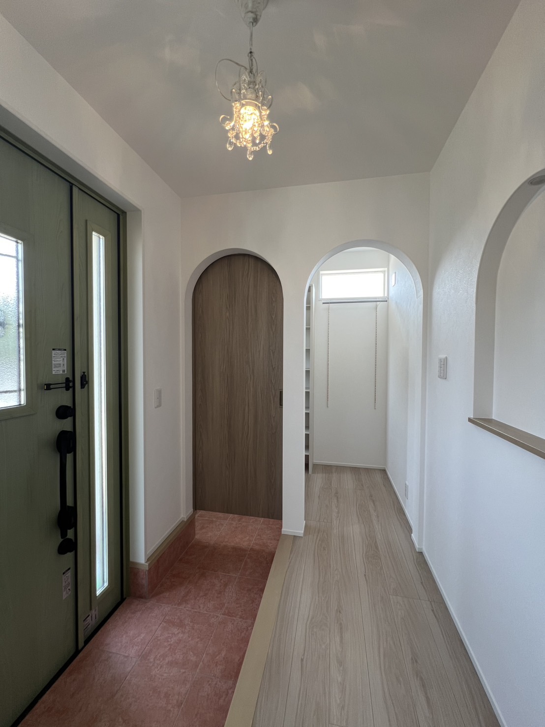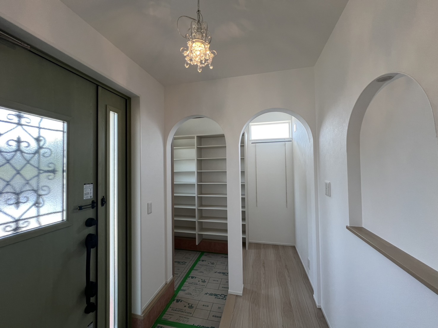 アンティークな風合いでトレンドに左右されない特徴的な外観デザインが魅力の家。玄関、垂れ壁、ニッチにアーチ型を取り入れることで可愛さと温かみのある優しい空間を演出しています。