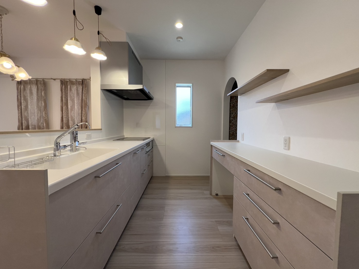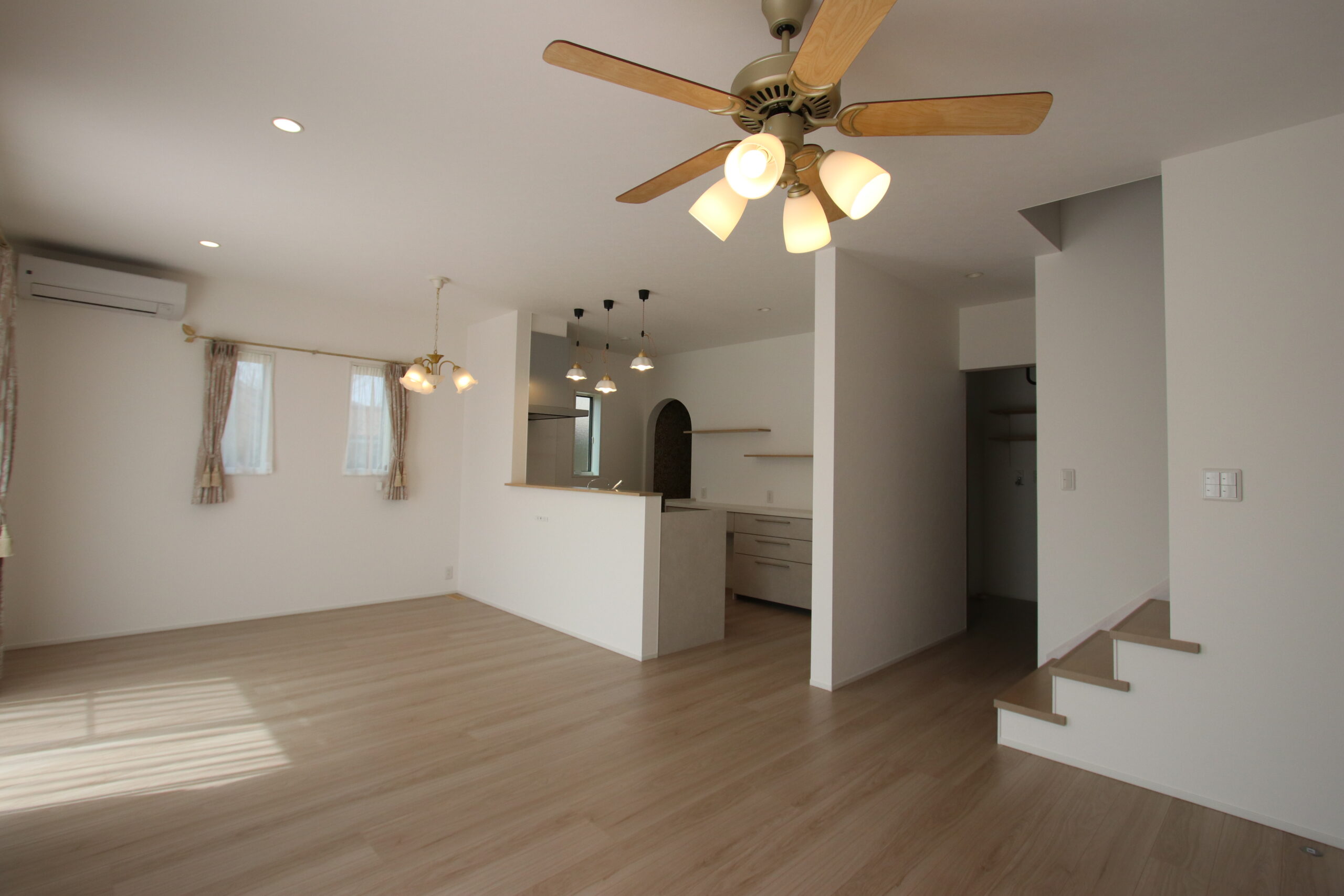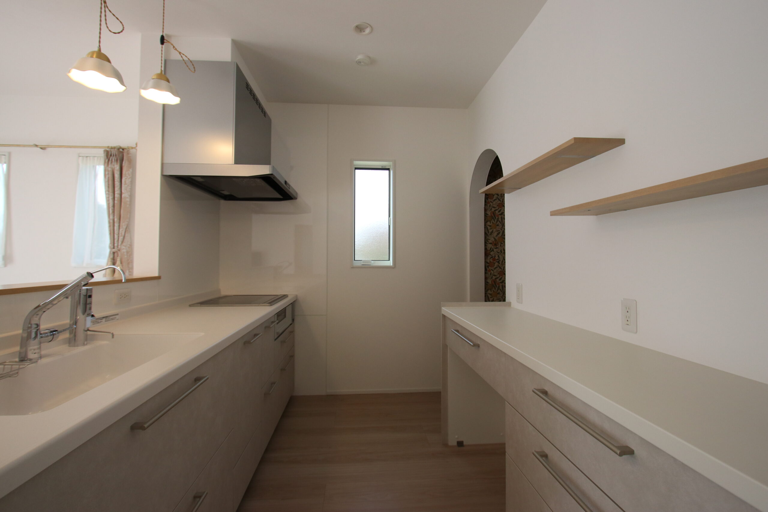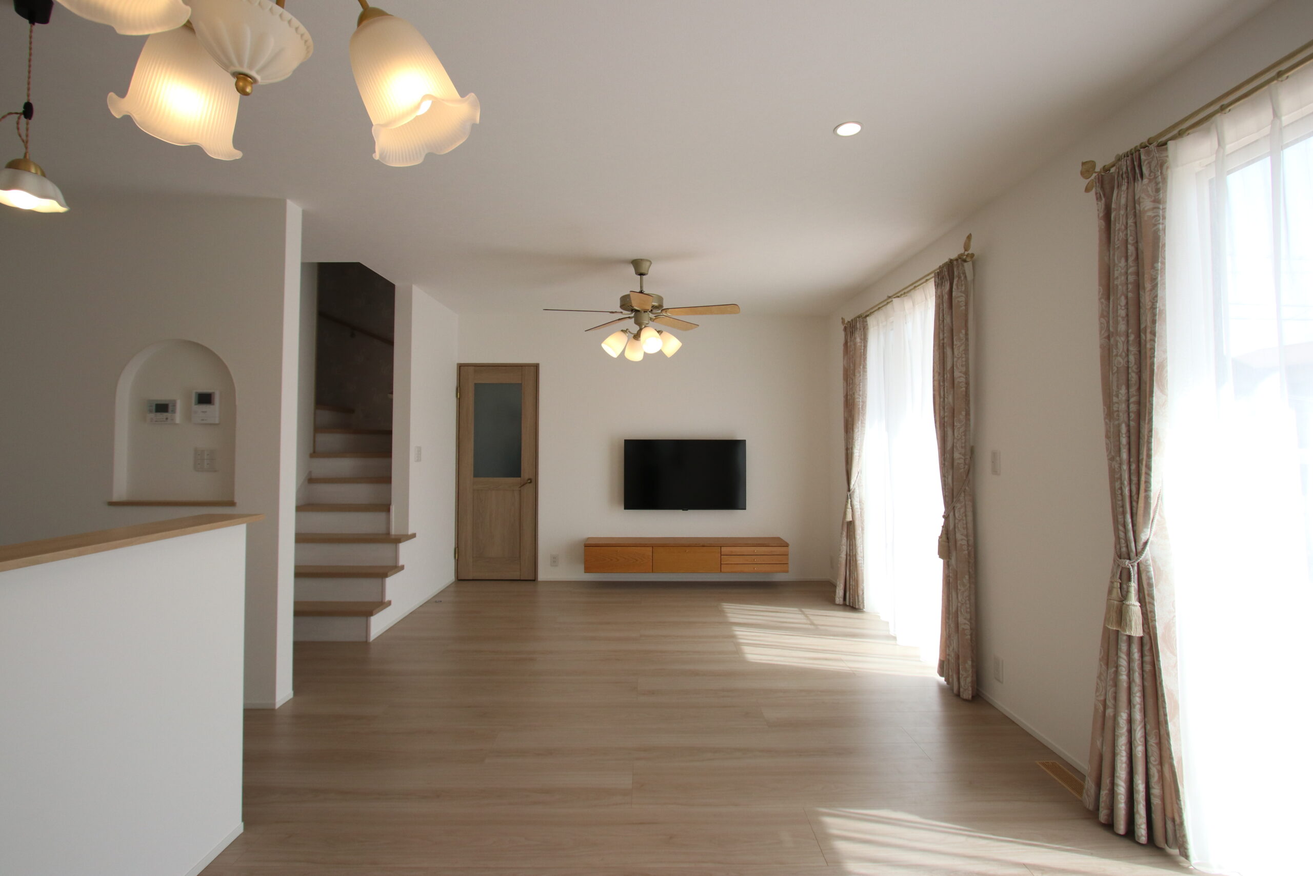 アンティークな風合いでトレンドに左右されない特徴的な外観デザインが魅力の家。玄関、垂れ壁、ニッチにアーチ型を取り入れることで可愛さと温かみのある優しい空間を演出しています。
